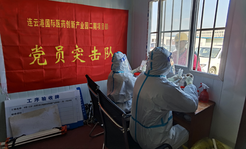 “請大家保持一米線,戴好口罩,有序參與核酸檢測,謝謝配合!”來自市級重大項目連云港國際醫藥創新產業園二期項目黨員突擊隊的成員席時棟、陳家輝喊道。據悉,該項目目前按照上級相關規定,實行閉環管理,做好相關疫情防控工作。“我們項目部嚴格按照市、開發區相關規定,做好閉環施工,疫情防控、項目建設兩手抓、兩手硬。”來自集團棚戶區改造裕源三期項目負責人青年黨員徐震說道。