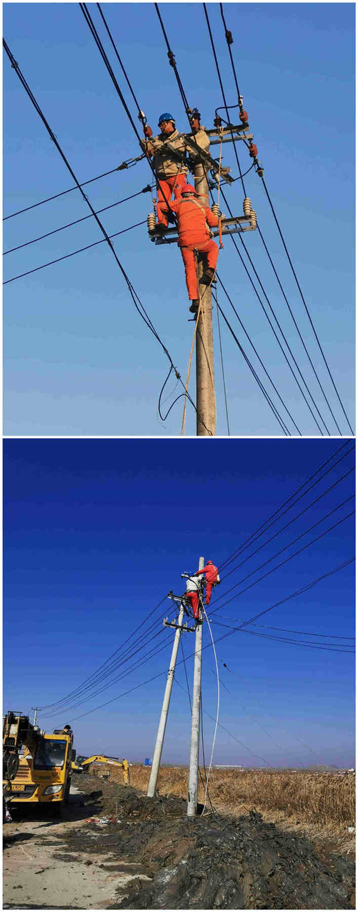 2月20日下午4點48分,青口供電所接到電話通知,黃沙分場送水道挖掘機施工碰倒10千伏養(yǎng)殖線電桿造成整個黃下線停電,請該所盡快派人處理。該所值班領(lǐng)導迅速組織線路工到達現(xiàn)場,經(jīng)勘察發(fā)現(xiàn)12米3向轉(zhuǎn)角桿電桿碰斷一根,120高壓導線拉斷3根.。為了不影響其他用戶正常用電,果斷將養(yǎng)殖線斷路器分離,恢復黃下線其他線路正常供電。同時上報公司領(lǐng)導,聯(lián)系機械及準備搶修所需材料。當下正值養(yǎng)殖池塘進水期間,為了盡快恢復養(yǎng)殖線供電,2月21日早上7點,搶修人員全部到位并進行安全交底及人員分工安排。7點30分所有機械到位,進行立桿、拔桿、地錨安裝、更換導線等系列工作。