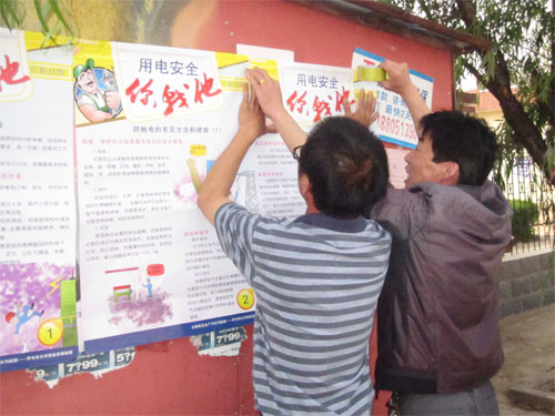 (圖為職工在社區張貼安全用電知識)