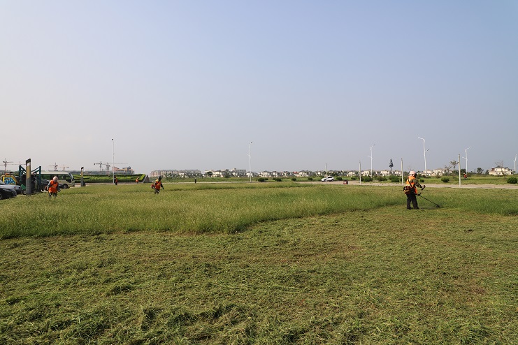 連日來,在臨港產業區辦公樓前,我們看到幾名南翼綠化公司的工人正在草坪上揮動割草機,忙碌的進行著除草作業。據了解,為了避開高溫時段,他們早上6點就開始工作,許多綠化工人都是五點多在家匆忙吃完早飯就趕往工作現場,有的甚至空腹上陣。工作現場,在經過一個夏天的生長,不少地方的雜草都近半米高,草叢內還有不少的碎石子等雜物,為了做好自身防護,工人們穿著厚厚的衣褲,戴著口罩、頭盔,肩扛除草機,一工作就是一上午。雖然近階段氣溫逐漸下降,但近30°的氣溫還是讓工人們吃不消。為了盡快完成工作目標,每一名工人都在咬牙堅持,默默地為更多的人營造一個優美、整潔的環境而做出自己的貢獻。(封楊)