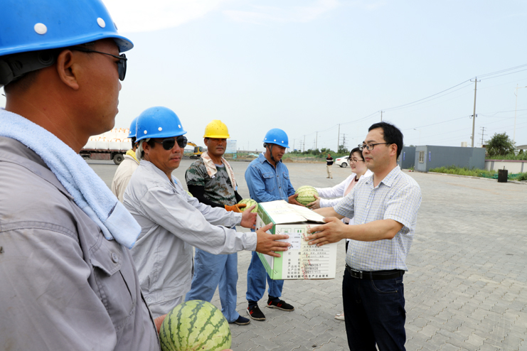 入伏以來,氣溫持續攀升,五灌河碼頭裝卸工作也迎來了夏季高溫的“烤驗”。為做好高溫酷暑期間的防暑降溫工作,確保職工工作安全和身心健康,7月25日,灌西工會一行到宵洋五灌河碼頭為堅守在崗位上奮戰的碼頭工人送去關懷和問候。 高溫籠罩下的碼頭暑氣蒸騰,灌西工會為碼頭工人送來了西瓜、白糖、綠豆、藥品等防暑降溫物品。并叮囑職工們要注意安全生產,做好防暑降溫工作。(張明建)