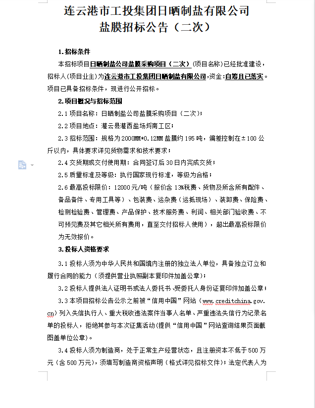 連云港市工投集團日曬制鹽有限公司鹽膜招標公告(二次)