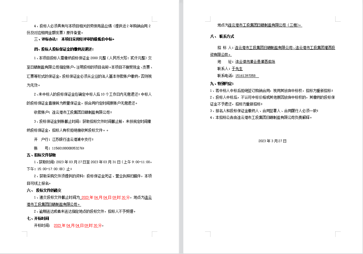 連云港市工投集團日曬制鹽有限公司勞保用品招標公告