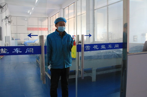 雪花鹽車間主任助理萬平正在對車間關鍵區域進行消毒。