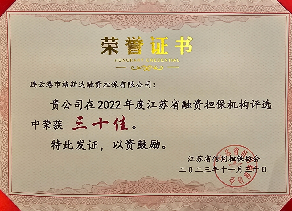??3月23日,江蘇省信用擔(dān)保協(xié)會(huì)在南京召開會(huì)議。連云港市格斯達(dá)融資擔(dān)保有限公司被授予“江蘇省2022年度融資擔(dān)保機(jī)構(gòu)三十佳”榮譽(yù)。本次全省共有71家融資擔(dān)保機(jī)構(gòu)參加評(píng)選,格斯達(dá)擔(dān)保公司成功入選。