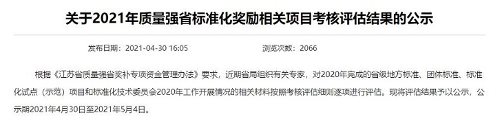 網址鏈接:江蘇省市場監督管理局 綜合通知 關于2021年質量強省標準化獎勵相關項目考核評估結果的公示 (jiangsu.gov.cn)