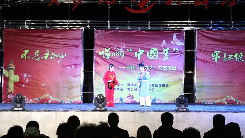 10 月 23 日 晚,猴嘴街道黃沙坨社區和青口公司聯合舉辦的以“不忘初心 牢記使命 唱響中國夢”為主題的慶十九大文藝演出活動在黃沙坨大舞臺舉辦,這是在秋收前,用豐富多彩的文娛方式慶祝十九大召開。猴嘴街道黨工委副書記王新崗、公司黨委副書記、副總經理史祥平現場觀看了演出。
