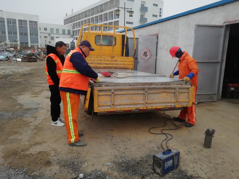 1月9日上午,經(jīng)過該公司設(shè)備維修班組再三斟酌,考慮如送修理廠維修,不但產(chǎn)生一筆不小的維修費(fèi)用,而且等待維修過程時間較長,影響工作進(jìn)度,為能給公司節(jié)省開支和不影響工作進(jìn)度,維修人員量好車廂底板尺寸后,將鐵板切割出需要的尺寸,一塊塊拼湊起來,加固在車廂底板上,通過半天的時間,順利為工具車底板披上一層合身、漂亮又特別的“盔甲”,有效延續(xù)了它的使用壽命。
