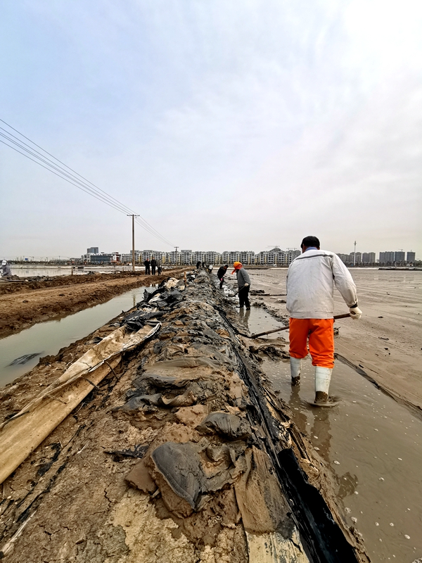 簡(jiǎn)單交流后得知,東灘4組要趕在月底之前,將原來(lái)用作復(fù)曬的格塊重新改為結(jié)晶池,搶抓旺季增加產(chǎn)量,而東灘人員少,工作量大,僅憑現(xiàn)有的10余名職工,等改造完了灘地,可能就已進(jìn)入了雨季,無(wú)奈之下請(qǐng)海州灣公司伸出援手。