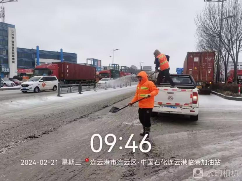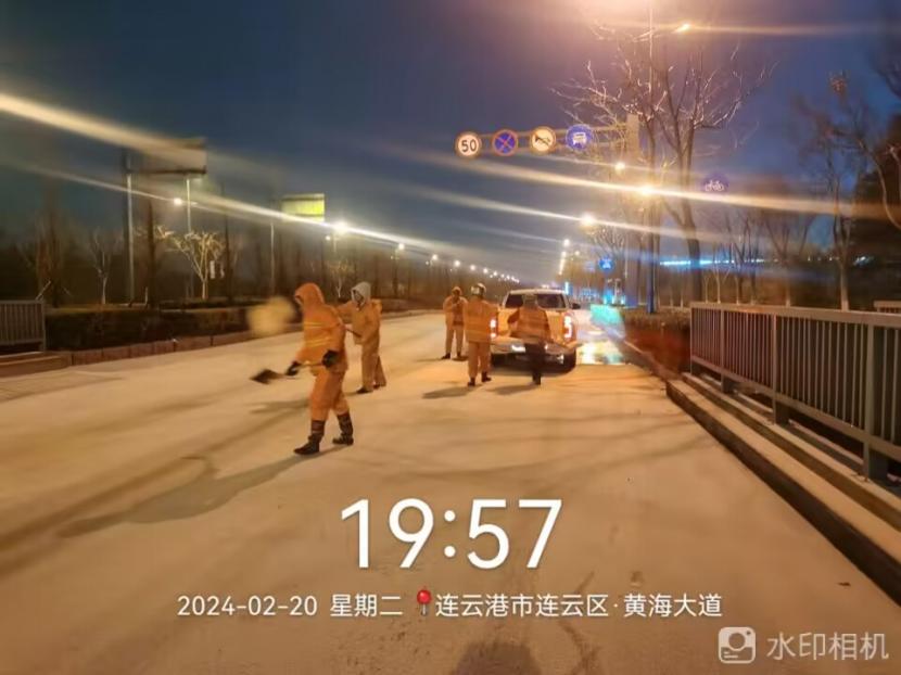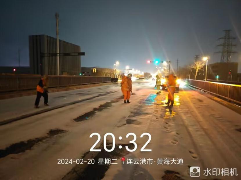 夜晚10點(diǎn),在黃海大道,支部書記范曉寶親自帶隊,帶領(lǐng)張巖、盛小雷、薛加兵等6名黨員,冒雪奮戰(zhàn)、連續(xù)作業(yè),拋撒融雪劑,進(jìn)行緊急除雪除冰作業(yè)。