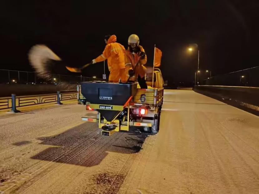 夜晚12點(diǎn),在佟圩路馬山立交,孫玉虎在工程車上一邊拋撒融雪劑一邊指揮:“融雪劑一定要撒布均勻,適當(dāng)擴(kuò)大距離,避免浪費(fèi)。”工程班金華、蘇志國、林軍、李林不停地在風(fēng)雪中揮舞著鐵锨,絲毫顧不上被風(fēng)雪擊打的面部疼痛。