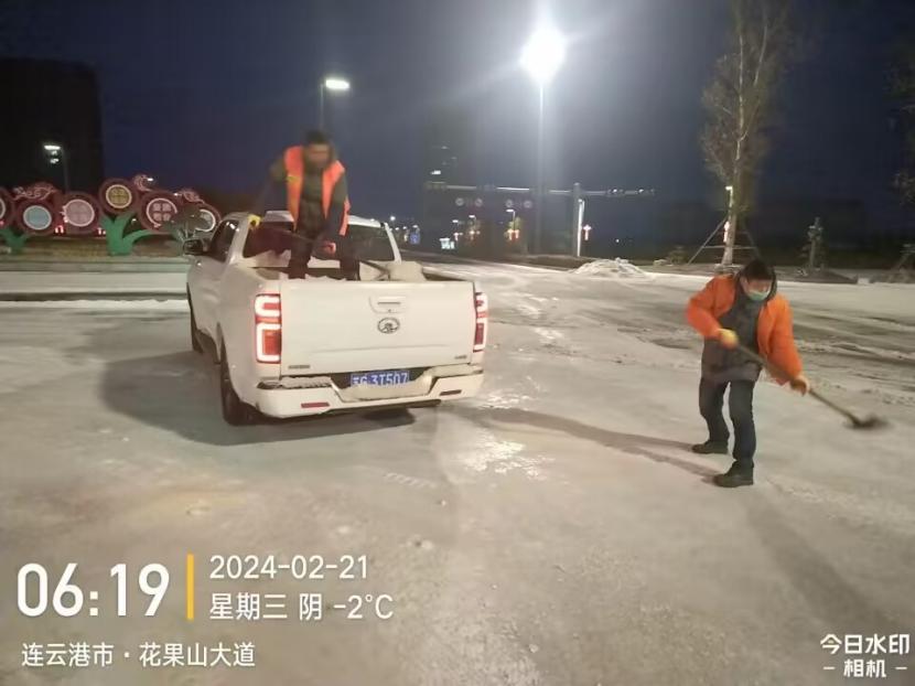 凌晨3點(diǎn),葛中仁、孫銀、薛興華、伏廣軍奮戰(zhàn)在花果山大道除雪現(xiàn)場,由于冰凍嚴(yán)重、路面濕滑,工程車行進(jìn)過程中舉步維艱,他們互相配合、齊心協(xié)力,時刻關(guān)注路面情況,確保道路無積雪、無結(jié)冰。