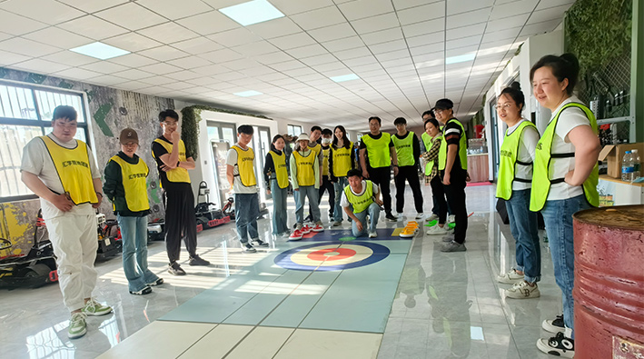 30余名青年骨干依次分成兩隊進行團隊拓展比賽,大家在暖場游戲破冰行動中相互熟悉。緊接著大家按照隊伍分組開展訓練游戲,訓練中大家集中精力,相互扶持幫助,共同完成對戰。其中冰壺游戲考驗每位青年的耐心和定力,需要瞄準方向,掌握好力度,共同協作得出好成績。多個極富挑戰性的項目在大家的齊心協力下順利完成。整場活動現場氣氛活躍,盡顯青春活力,比賽的形式也將本次活動推向了高潮。